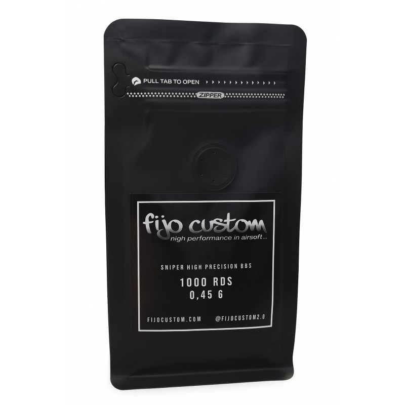 Bolas para airsoft de 6 mm de diámetro y 0,45 gramos de peso caada una, de alta precisión, alta calidad y alto pulido, especialmente fabricadas para rifles de sniper de cerrojo, de la marca Fijo Custom. El mayor peso proporciona estabilidad frente al viento, agrupa mejor a larga distancia y permite trabajar con gomas de hop de dureza media/alta sin ajustes extremos. La superficie pulida favorece la alimentación y reduce atascos, mientras que el cierre ZIP de la bolsa facilita el transporte y la recarga sin derrames, contando también con una válvula de sellado antirretorno que permite transportar las bolas sin aire, evitando golpes y roces entre ellas. Recomendadas para rifles de cerrojo y plataformas a gas orientadas a precisión; válidas también para configuraciones eléctricas preparadas para tiro fino siempre que la cámara y el cañón estén en buen estado y limpios. Para un rendimiento óptimo: limpiar el cañón, ajustar el hop de menos a más y no mezclar pesos distintos en el mismo cargador. Un consumible diseñado para quienes priorizan consistencia, trayectorias previsibles y agrupaciones cerradas en media y larga distancia.