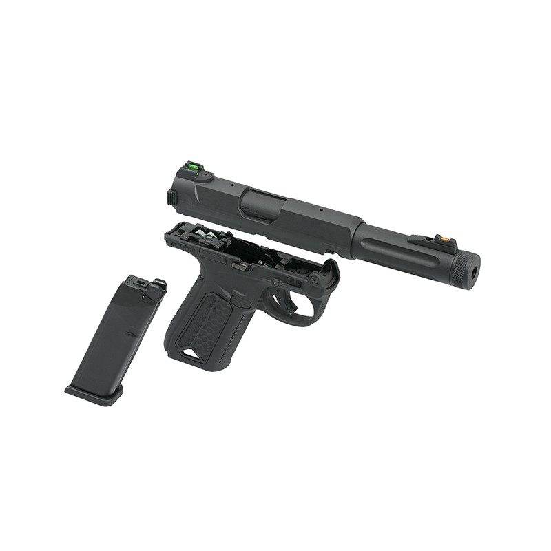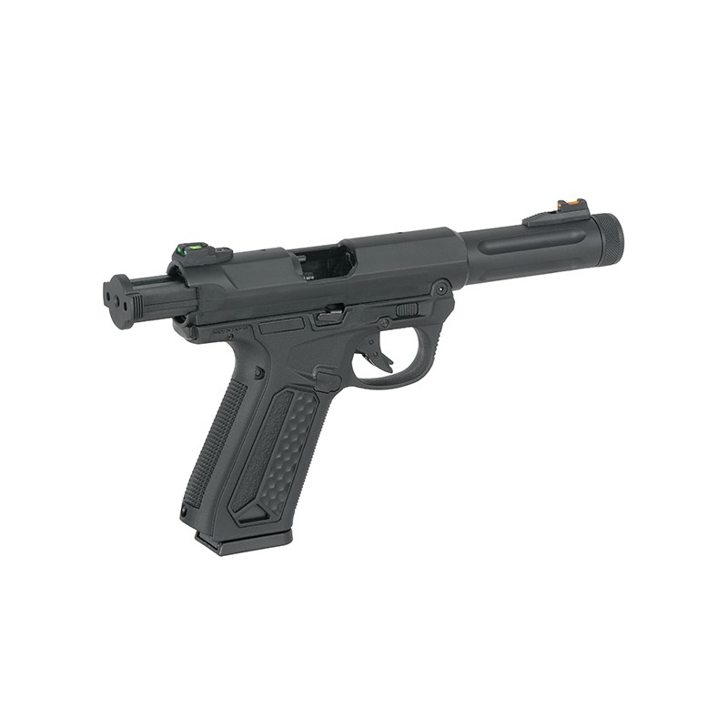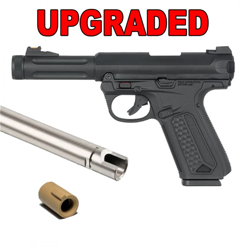 Pistola AAP01 de Action Army upgradeada con cañón 6,02 mm de 129 mm de longitud corte GBB con Dual Bore Fijo Custom y goma crema Modify.