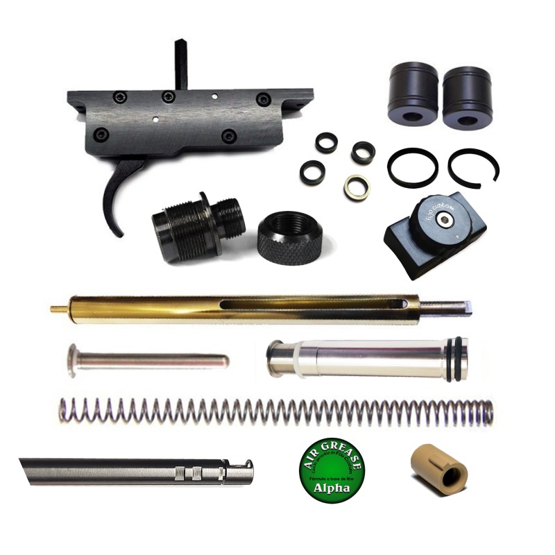 Este conjunto de gatillo, pistón, guía, muelle, cilindro y cabeza de cilindro, nos proporciona una alta potencia sin ningún tipo de fugas, optimizando el funcionamiento del rifle. Permite el uso de muelles más flojos para conseguir una potencia y alcance mayores con un acerrojado muy suave gracias a su conjunto duradero y resistente con una excelente compresión.